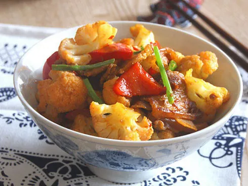 菜花500克 五花肉100克 红尖椒2个 姜4片 蒜5克 食盐1.5小勺 酱油2勺