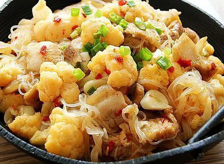 8、待菜花软烂后,倒入粉丝炒匀、加入鸡精调味