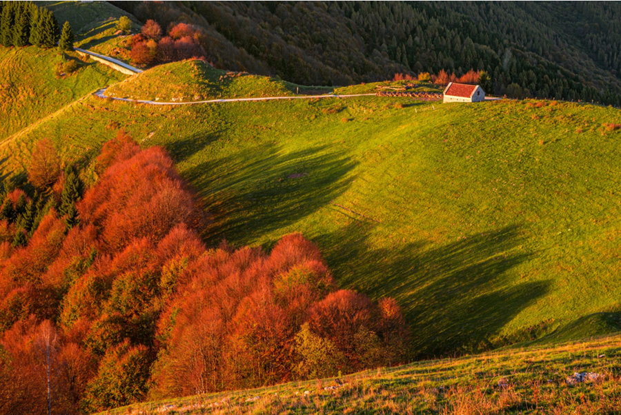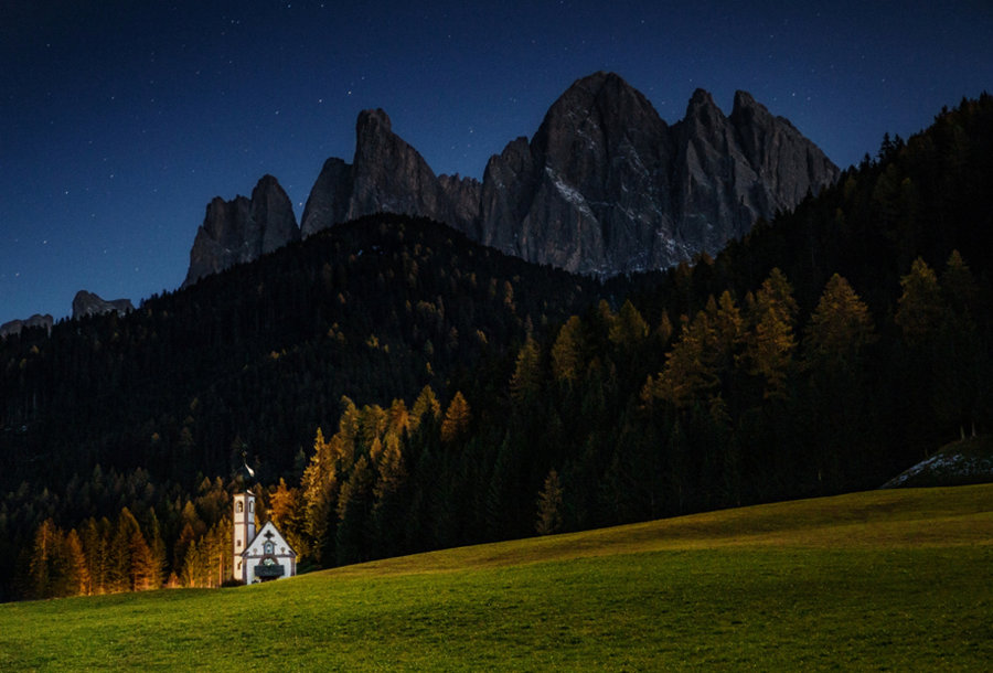星空如沙,山峦如画,富内斯山中的教堂古朴稚拙,仿佛游侠与圣徒经行之地。