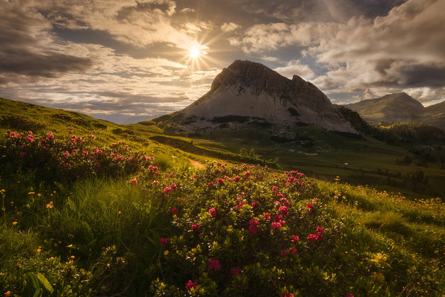 圣马蒂诺的晨曦,太阳在云层中光芒四射,花丛中的光影流动迷人至极。光风转蕙,泛崇兰兮!