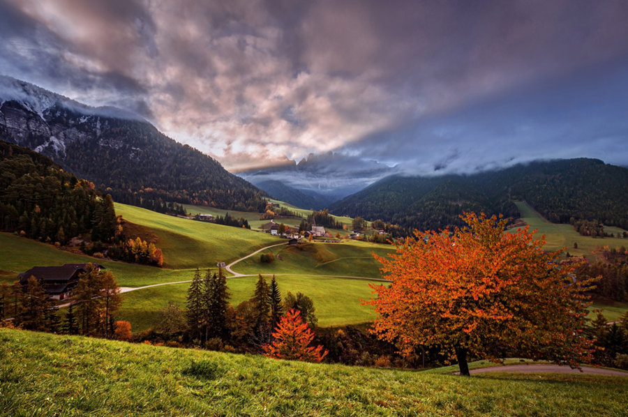 小村庄安详静谧,靓丽的色彩和浓云远山形成饶有趣味的对比。