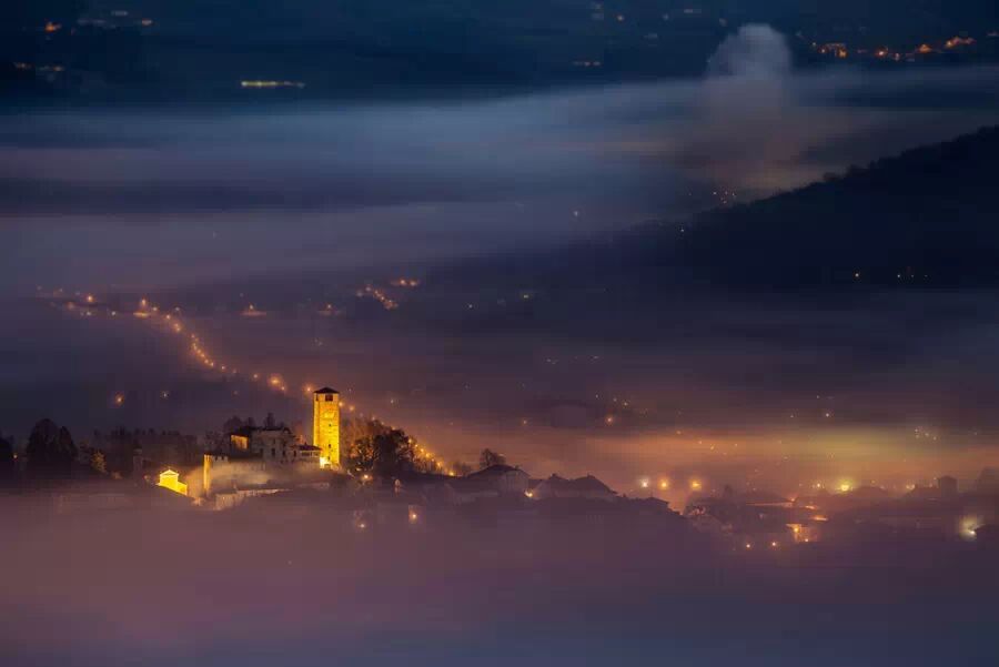 照片拍摄的是意大利东北费尔特勒城中的古堡和高塔,夜雾和灯光使它像仙境一般迷人。