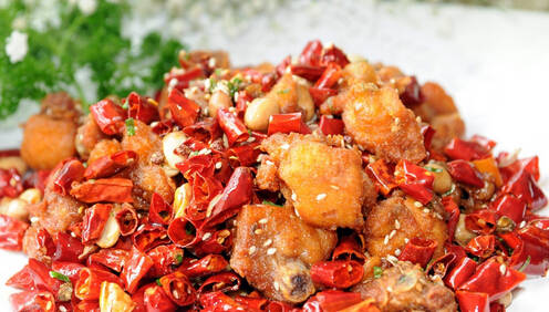 4、大火烧热油,放入姜、蒜片爆香,放入辣椒花椒,放入炸好的鸡块翻炒,撒入鸡精白糖和葱段炒匀。