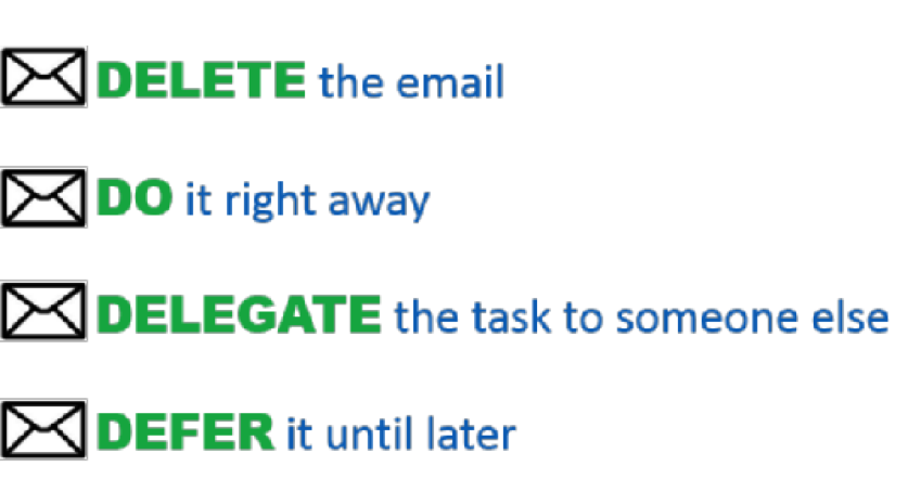 别把事情放在一边,觉得你之后会有时间回来做。每次看到邮件里的任务时问问自己“这件事我要怎么做”,你可以着手去做,稍后再做,交给别人做或者把它归档。