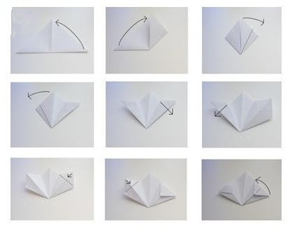 每一张正方形的纸折一个花瓣,每五个花瓣组成一朵小花。折好五个花瓣后,用胶带纸粘成一朵小花。