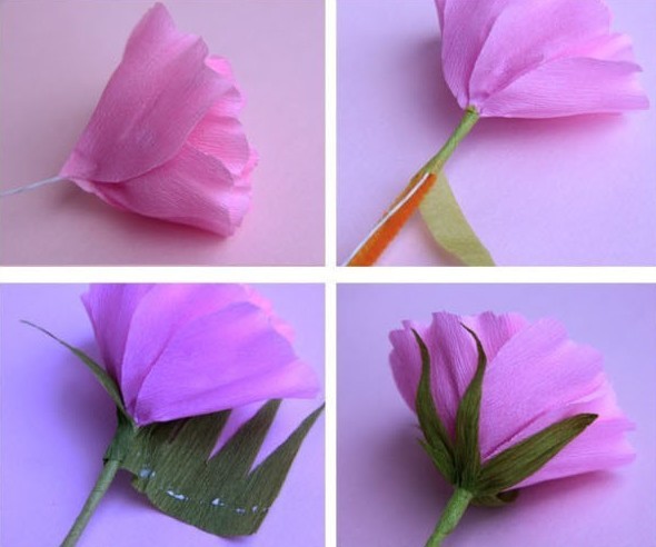 把铁丝用绿色的皱纹纸包好,在贴上剪好的绿色叶子好了