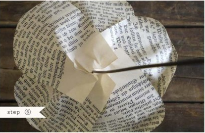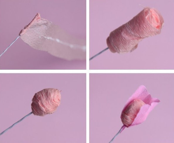 剪开纸条成条状,把纸条绕在铁丝上做花蕊