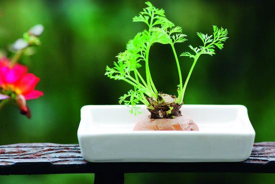 栽培:胡萝卜土切面朝下,平放在容器中,加少量清水。
