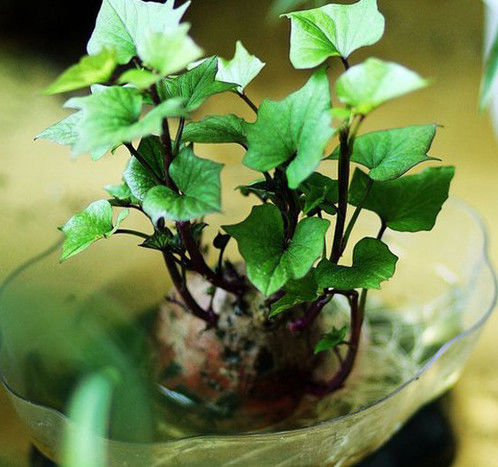 秘籍:除了半个栽培,还可以把一个红薯切成多块,按自己的喜好设置盆栽。与红薯类似的土豆也可以如此利用。
