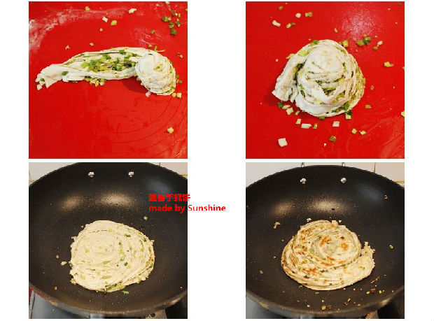 7、将锅里刷一层油,将卷好的面团再擀开,中小火煎。
