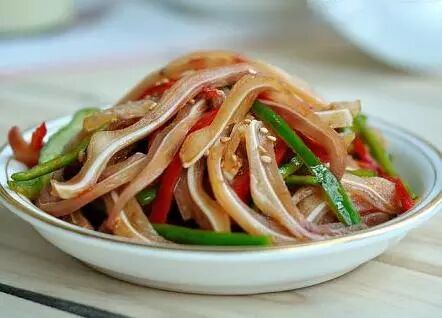食材:猪耳朵300g、香油适量、生抽适量、蒜末适量、彩椒适量、白糖适量、黄瓜丝适量、鲍鱼汁适量、陈醋适量