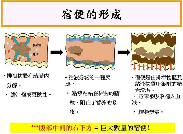小肠内的宿便,一旦发酵、胀气后,所产生的化学毒素会污染血液,进而逐渐循环全身,终致造成酸毒症(acidosis),同时会加重肝、肾、皮肤三大排毒器官的负担。常疲劳、脚底痛、感觉睡不饱的成员,或许成因就是 宿便 先生造成的哦!