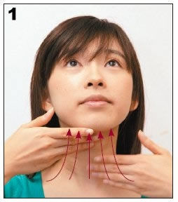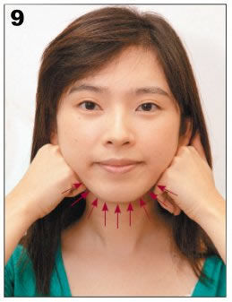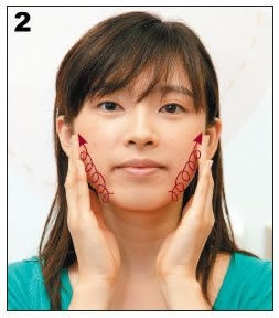 步骤二:从下颚到耳边轻轻抚摸。从下颚到耳根背后,再从鼻翼两侧到颧骨下的凹陷处,最后回到耳边,做来回的平滑按摩,做10个来回。