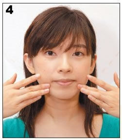 步骤四:将下颚的凹陷处往上压。顺着脸的线条向上压,让脸部线条逐渐清晰起来,动作要有力但避免戳伤下巴的凹陷处,同样做3次,每次做3秒钟。