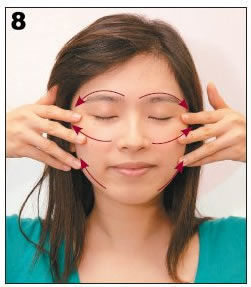 步骤九:沿着眉骨按摩眼皮。两眉用食指轻压,要沿着眼睛的上方骨,按摩到眼尾处。同样也是做3次,每次3秒钟。