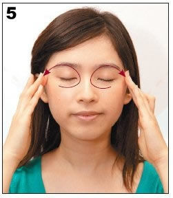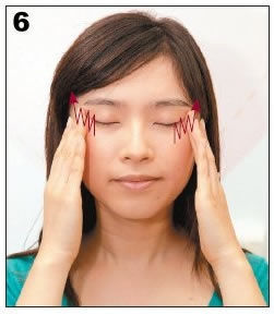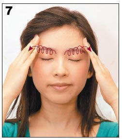 步骤八:按摩额头。用食指、中指、无名指三根手指,轻轻横向按摩额头,做10个来回,让额头舒展开来。