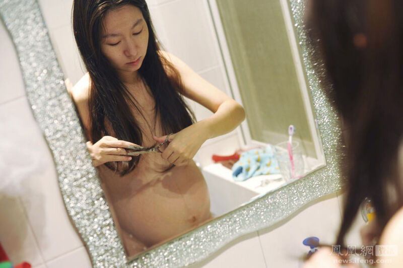 2013年11月12日,怀孕第172天,长发营养不足,发梢分叉,屡次劝剪头发而不听,juju选择自己修剪枯发。