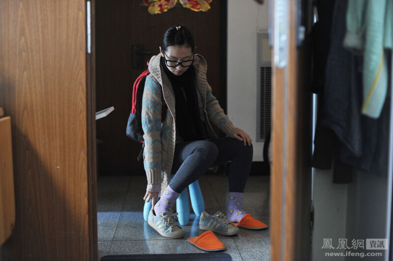 2013年10月16日,怀孕第145天,早上出门,肚子已经影响到下蹲动作,juju只能坐在凳子上换鞋。