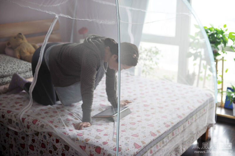 2013年11月5日,怀孕第165天,juju在限制的距离内用ipad看美剧。