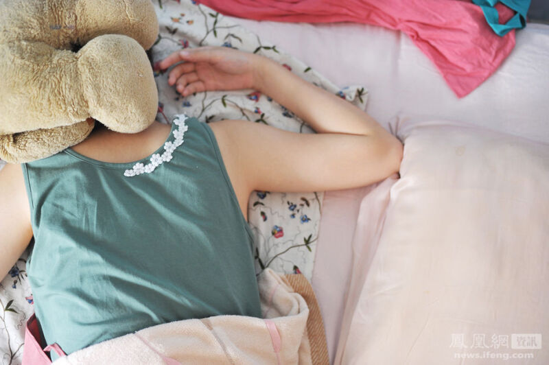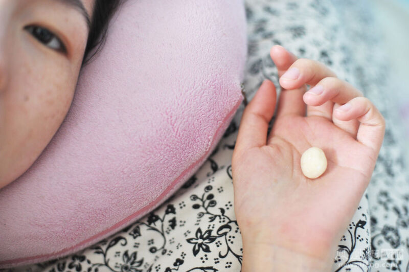 2013年8月6日,怀孕第74天,胃疼中,juju抓着一颗糖丸躺在床上休息。