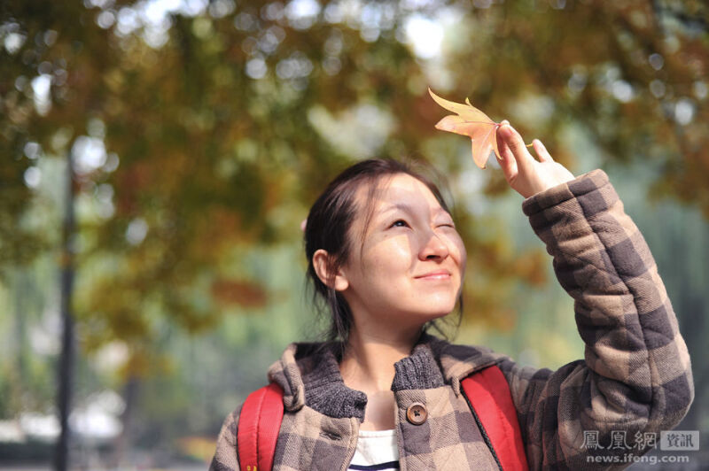2013年11月2日,怀孕第162天,逛紫竹院公园时,juju迎着阳光观察一片枫叶的叶脉。