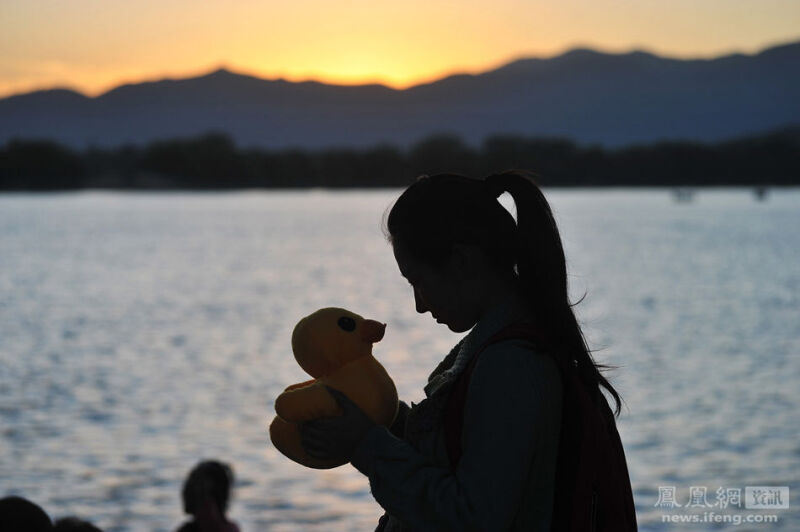 2013年10月2日,怀孕第131天,juju去颐和园看大黄鸭,在夕阳下玩小黄鸭玩具。