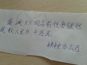 我接过纸条一看,上面写着:兹派 xx 同志前往贵银行提取人民币十万元。下面落款是中共中央办公厅。看着这极不规范的手写纸条,我立马肯定这是个骗局,只是觉得这个骗局也太“小儿科”了。我正在犹豫是否要报警,突然发现这位女子的脸上神情恍惚,穿着也很凌乱。