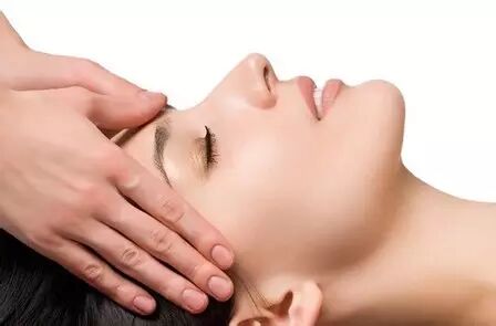 以左右大拇指罗纹面接左右眉头下面的上眶角处。其他四指散开弯曲如弓状,支在前额上,按探面不要大。