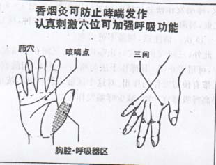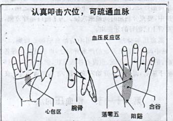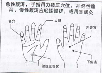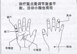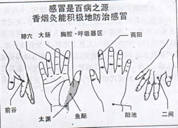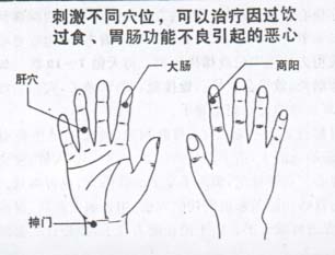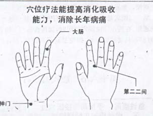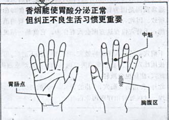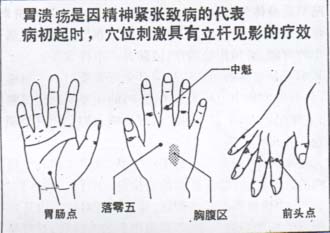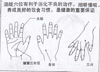 一. 循环系统 高血压高血压是一种以动脉血压升高, 尤其突出的是舒张压持续升高的全身性慢性血管疾病,主要与中区神经系统和内分泌液体调节功能猕乱有关,也与年龄、职业、环境、肥胖、嗜烟等因素有关。中医理论认为主要由于肝肾阴阳失调所致。 具体治疗方法: 治疗高血压要首先按压阳谿、合谷、落零五穴及整个血压反应区。 手法是用力按压。 用一根一束的牙签强刺, 会获得更高的疗效。 良好的心脏功能, 是保证血脉通畅的必要条件。 所以要促进全身血液循环,必须加选手心的心包区, 手背的腕骨穴的按摩、刺激才奏效。 在体检或是定期检查时, 如果医生说你的血压高, 应立即开始做穴位疗法, 用牙签刺激穴位,按摩穴位, 很快血压就出现下降。 每天坚持治疗, 血压会持续逐渐下降。 按摩的穴位:腕骨 、血压反应区、 零落五、心包区、合谷、 阳谿 低血压 通常收缩压在100 毫米汞柱以下, 便为低血压, 底血压者往往血管收缩力差,血流不畅。 因此, 血液不能流到毛细血管的每个角落, 以心脏为主的血液循环系统功能不良,从而出现低血压特有的症状: 站起来时眼前发黑,手脚冰凉、耳鸣等。 具体治疗方法: 在治疗低血压时,需选择与心脏关系密切的心经、心包经及与心包经关系很密切的三焦经上的穴位。 取手腕掌侧的神门、太陵穴,手背的阳池、中渚穴, 这四个穴位都是治疗低血压很有效的穴位。 另外,还可加取手心的心包区和手背的血压反应区, 这两个区带也是治疗低血压敏感区。 常时间慢按揉、轻捻搓。 刺激要领是柔和而轻松。 按摩的穴位: 血压反应区、 中渚 、 神门、 太陵、 心包区、 阳池 二. 消化系统 便秘 便秘是食物滞留肠中,其中的水分被过多吸收而引起的。如果排泄不畅, 废物滞于肠中并被吸收进入血液, 一定会引起各种内脏功能失调。 具体治疗方法: 请伸开您的五指试试, 用力撑五指,也许会感到中指和食指间胀痛吧,胀痛部位是第二二间穴, 该穴利于通便,伸五指这里出现胀痛, 就是反映便秘的症状。 按压第二二间穴。能促进通便, 在按压揉搓该穴的同时, 加揉食指的大肠穴和手碗的神门穴。 只要揉到好处, 即使是顽固的便秘,也能很快治愈。 按摩的穴位: 第二二间 神门 大肠 腹泻 通常腹泻是因为胃肠消化功能不良,吃下的食物在肠内发酵所致, 因此,欲止住腹泻,必须很好地提高肠胃的消化吸收功能。 具体治疗方法: 下痢穴是特效穴中的特效穴, 用手指用力按压此穴, 便意会立即消失。出现严重腹泻时,刺激此穴, 症状也会减轻。 此外,食指的大肠穴, 小指的肾穴,手背的外劳宫穴,手掌的的健理三针区等对治疗腹泻也很有效。 按摩的穴位: 外劳宫、 下痢点、 大肠、 健理三针区、 肾穴 消化不良 胃具有消化食物的功能, 是人体的能量之源、精力的基础。 即使平时很健康的人。因莫种原因得了胃病,身体很快会变瘦,声音也往往变小, 为了应付繁忙的工作和充实地度日, 保护好自己的胃, 使胃处于健康状态是十分必要的。 具体治疗方法: 治疗消化不良的区带是手心稍下的健理三针区, 因为该区是提高以胃肠为主的各种内脏功能的特效区带, 如给予充分的刺激, 一定会提高胃肠消化能力和整个内脏的功能, 再加刺食指根部附近的三间穴、食指第一关节掌側的大肠穴和合谷穴, 胃的消化功能就会不断提高, 温暖这些穴位, 香烟灸最好。 睡前身体松弛时, 用香烟灸 8-10 次。 不知不觉便会忘记胃的位置, 同时会感到精力充沛、活力洋溢。 按摩的穴位: 三间、 健理三针区、合谷、大肠 胃痛和胃溃疡 吃了太凉、腐败和不好消化的食物,或过饱,过饮时, 第二天肚子发胀,恶心,同时出现胃痛。 胃痛得严重时, 甚至发生休克, 这就是胃痉挛。 当突发胃痛或胃痉挛时, 为了止痛, 最好采用穴位治疗。 具体治疗方法: 治胃痛最好的穴位是胃肠穴点, 手心稍下方的胃肠穴,它与胃和肠有密切的关系。如按压刺激此穴, 可以抑制胃肠功能。具有止痛的效果。,同时按压手背拇指根部稍靠下的落零五穴, 也很有效。 治疗胃溃疡的穴位: 胃肠穴, 手背的胸腹区,食指上的前头穴, 中指的中魁穴, 每天用香烟灸这些穴位 7- 14 次, 能抑制胃酸分泌。 所以胃的情况会渐渐变好。 按摩的穴位: 胃肠穴、 落零五、胸腹区、中魁、前头点。 痔疮 俗话说"三个大人, 一人痔" 患痔疮的人之多, 可想而知。 究其原因, 有人说是饮食习惯所致, 也有人说是生活习惯引起等等。 一般的情况下, 静脉血管中有静脉瓣, 可以防止血液返流。 不知为何, 只有肛门静脉没有瓣, 造成血液返流,淤滞。 血液长时期淤滞, 这一部分便因淤血而鼓起。 甚至破例出血, 所以治疗痔疮的要点, 应放在提高肛门括约肌的收缩能力上。 以促进血运, 防止静脉血液滞流。 具体治疗方法: 用香烟灸会阴穴, 由于使肛门括约肌受到锻炼, 提高了肌力, 所以能很好地止住出血。 每天早晚灸 15 --30 次, 一定要耐心仔细地灸, 才能收效, 除会阴穴外, 手背上的合谷穴和手掌侧食指第一关节的大肠穴也是治疗痔疮的好穴位。 用手指按压这两个穴, 也会很快收效的。 按摩的穴位: 大肠、 会阴点 烧心 因烧灼痛症状出现在心口窝, 所以称为烧心。 多数病人是因为胃酸分泌异常,特别是胃酸分泌过多造成的。 胃酸逆流上行到食道,所以才感到食道附近疼痛。 具体治疗方法:治疗烧心的穴位疗法, 是手