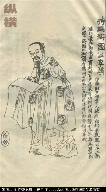李靖(571年—649年),字药师,京兆府三原(今属陕西)人,唐朝伟大的军事家、军事理论家、统帅,才兼文武,出将入相。出生于官宦之家,祖父李崇义曾任殷州刺史,封永康公;父李诠仕隋,官至赵郡太守;舅父韩擒虎,为隋朝名将,官封上柱国大将军。李靖长得仪表魁伟,由于受家庭的熏陶,从小就有“文武才略”,又颇有进取之心,曾对父亲说:“大丈夫若遇主逢时,必当立功立事,以取富贵。”曾得到前隋吏部尚书牛弘和大将军、左仆射杨素的大力称赞。早年曾察觉隋朝太原留守李渊有反状,准备去告密,结果被李渊俘获,后被李世民欣赏而救下。李靖善于用兵,长于谋略,原为隋将,后效力李唐,为唐王朝的建立发展立下赫赫战功,南平萧铣、辅公祐,北灭东突厥,西破吐谷浑,是诸多将领中唯一可以和李世民媲美军功的人,其人善于明哲保身,故而终生无大患。宣武门之变前,李世民曾拉拢他,但被委婉拒绝,保持中立。其于大唐军事功劳太大、军事能力过高遭人疑忌,屡次被诬告谋反,为免嫌疑,主动退休闭门不出,直到老死。但太宗非常欣赏他的才能,曾经多次问计于他,乃至于北征高丽、侯君集谋反等事件一一从李靖口中得到验证。公元649年(贞观二十三年),李靖病情恶化,唐太宗亲临病榻慰问。他见李靖病危,涕泪俱下,十分难过地对李靖说:“公乃朕生平故人,于国有劳。今疾若此,为公忧之。”这年四月二十三日(7月2日),李靖溘然逝去。享年七十九岁。唐太宗册赠司徒、并州都督,给班剑、羽葆、鼓吹,陪葬昭陵。谥曰景武。坟墓如同卫青、霍去病故事,筑坟形如同突厥内燕然山、吐谷浑内积石二山形状,“以旌殊绩”。