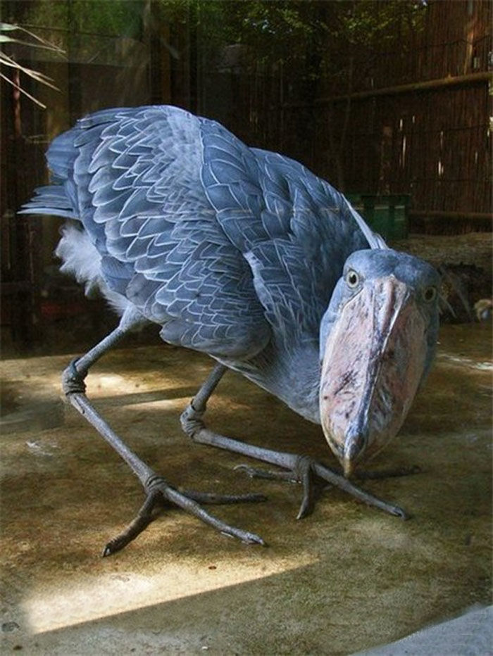鲸头鹳,由于其貌不扬,堪称世界上最丑的鸟类,有时也叫“兽步鸟”。通常身高达1.5米,体重7千克,两翼展开时宽达2.6米,腿长,头巨大,嘴宽大而粗壮,顶端有钩,形如荷兰人的木鞋,故又称为“鞋之父”。