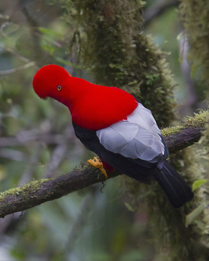 安第斯冠伞鸟,秘鲁的国鸟。每到繁殖季节,雄鸟就会聚集到求偶场内,透过点头及快速跳起来夸耀其亮丽的羽毛,并发出不同类型的呜叫。它就像戴了一个红色的头罩.....