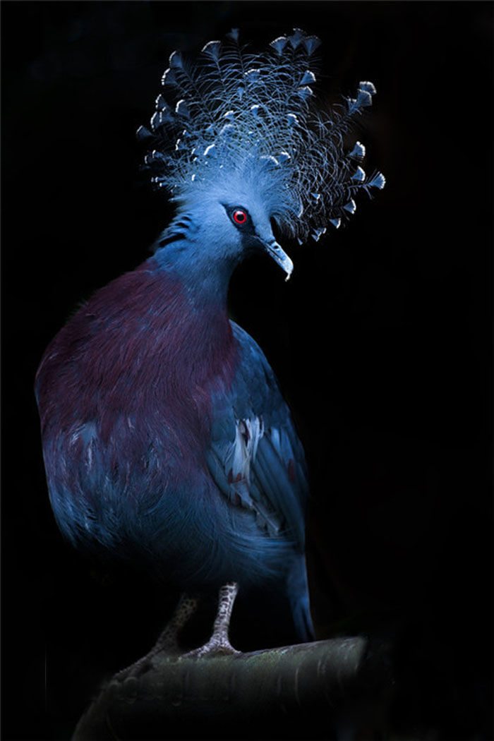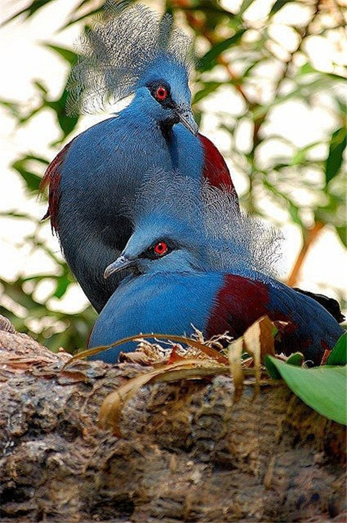 蓝凤冠鸠雌性与雄性外形非常相似。拥有蓝色头冠,羽毛一般为蓝紫色,有时也有黑色羽毛甚至全身黑色。像不像贵妇人呢?