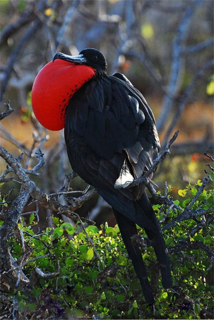 大军舰鸟,雄性大军舰鸟的喉囊特征显著,其皮肤呈鲜红色,当缩小变橙色时,预示着已进入繁殖期。此时喉内会吸人大量空气,鼓胀起来如同红色的风帆,鲜艳夺目,并以此炫耀,吸引雌鸟前来交配。我总担心它会爆喉......