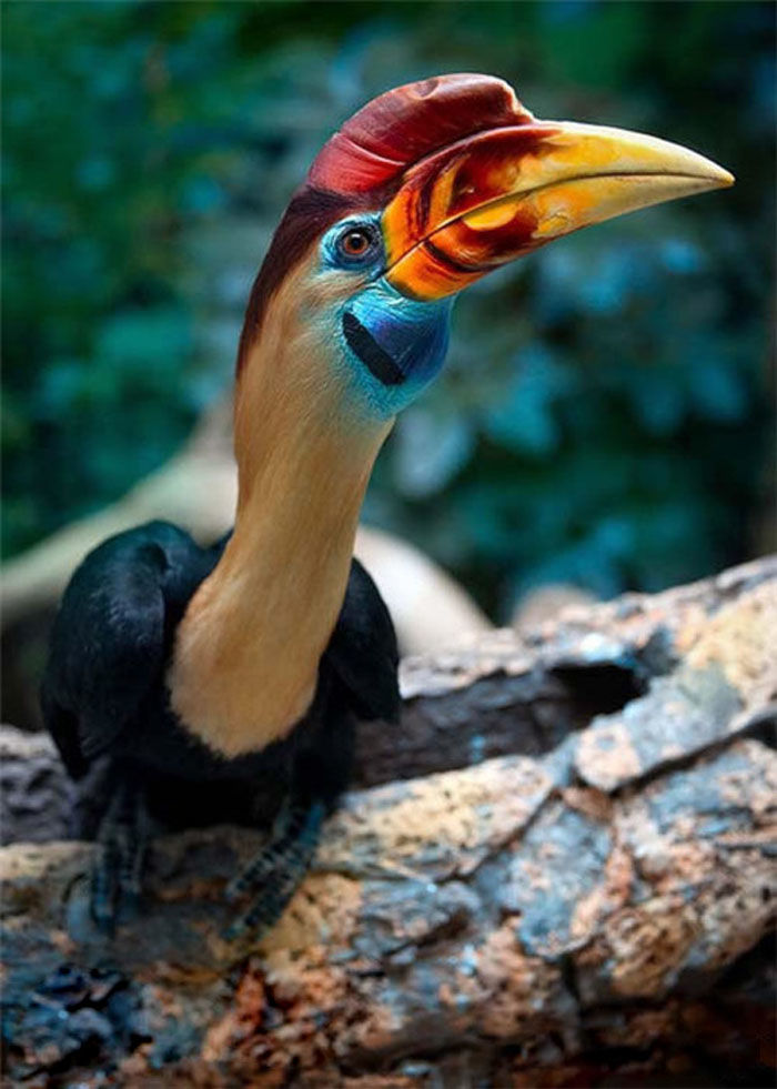 雄犀鸟,犀鸟以某些种类上嘴基部的骨质盔突而著名。嘴就占了身长的1/3到一半,宽扁的脚趾非常适合在树上的攀爬活动,一双大眼睛上长有粗长的眼睫毛。最古怪的是在它的头上。长有一个铜盔状的突起,叫做盔突,就好像犀牛的角一样,故而得名犀鸟。