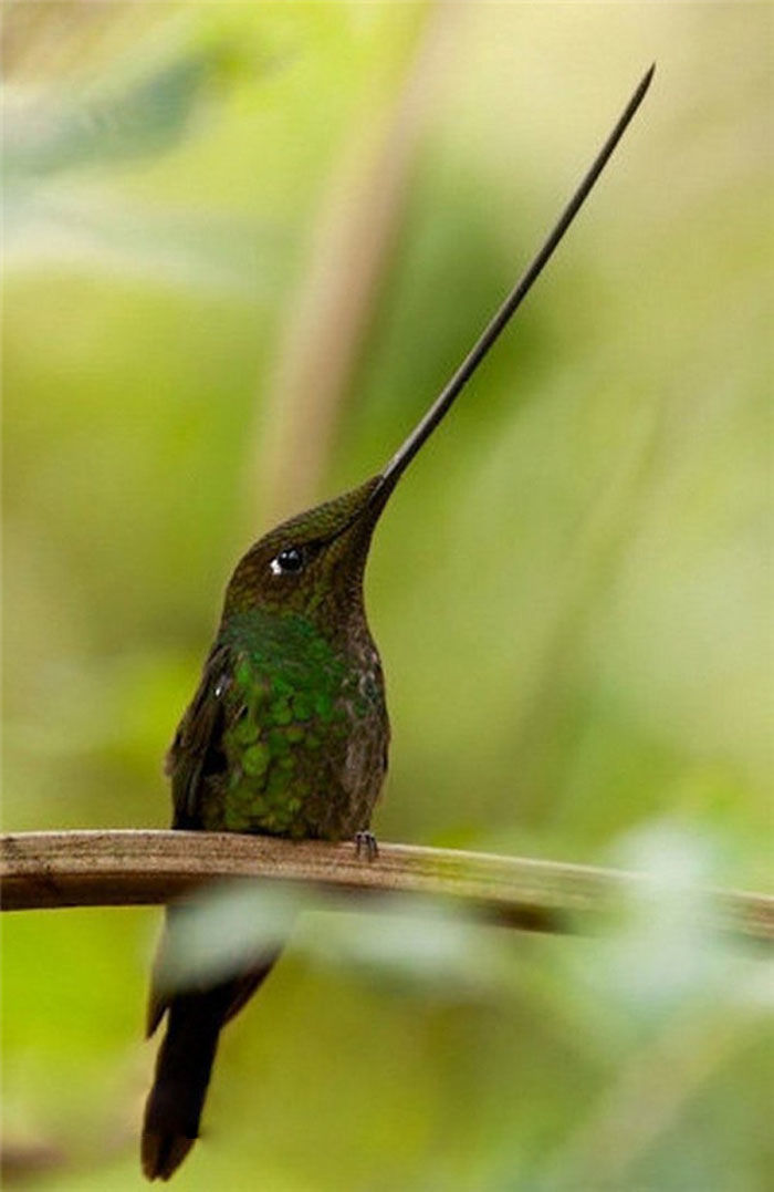 刀嘴蜂鸟,全身都闪耀着金属光泽。尤为奇特的是,它的管状的喙细长如剑,长度可达10.5厘米,几乎恰好是它体长的一半,非常美丽。另外,它在飞行时像蜜蜂一样,双翼拍动很快,并产生一种如同蜜蜂发出的嗡嗡声,所以得名刀嘴蜂鸟。