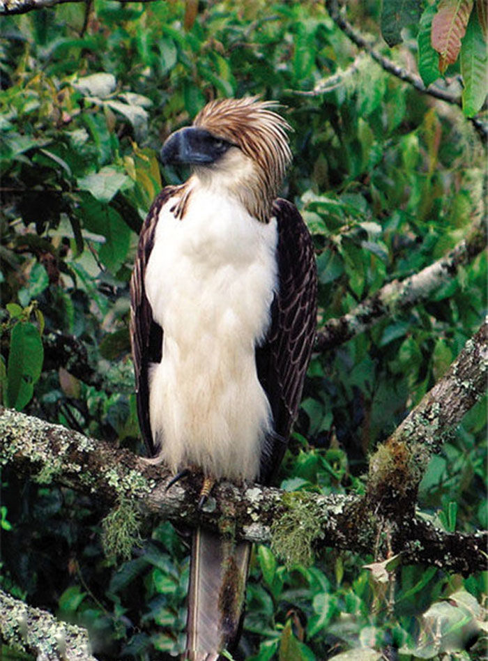 菲律宾国鸟:食猿雕,体态强健,相貌凶狠,体长1米,重9公斤,两翅展开长达3米。上半身羽色为深褐色,下半身为浅黄或白色相间,头部后面有许多柳叶状冠毛,色黄有斑点。面部和嘴为黑色,遇对手或猎物时冠羽会立即竖起成半圆形。冠羽高耸,面目古怪,显露出一副“鹰中之虎”的凶狠相。