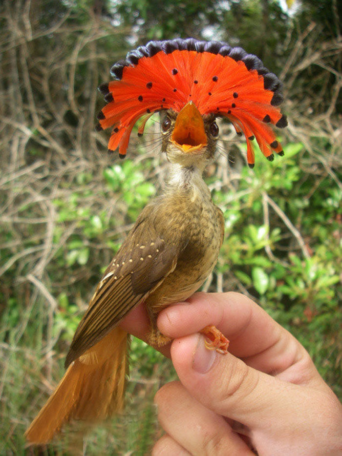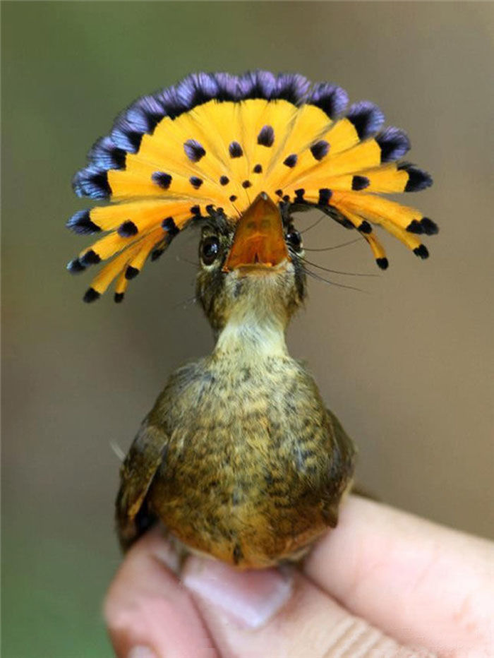 北方皇家姬鹟,体长16.5-18厘米,头顶有一个可以竖起来的扇形羽冠,雄性为红色,雌性为黄色。也是就是欧洲皇室的装扮......