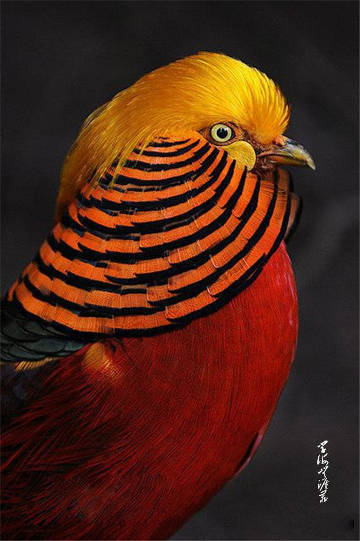 中国红腹锦鸡,又名金鸡,雄鸟羽色华丽,头具金黄色丝状羽冠,上体除上背浓绿色外,其余为金黄色,后颈被有橙棕色而缀有黑边的扇状羽,形成披肩状。