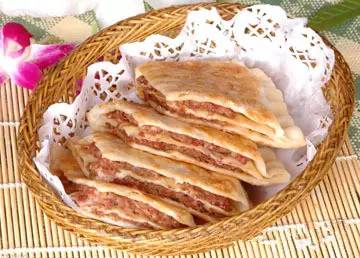 7.平底锅内放油,放入叠好的肉饼,盖上锅盖,小火将其煎至两面金黄中间熟透时即可.吃时再切成自己喜欢的大小.