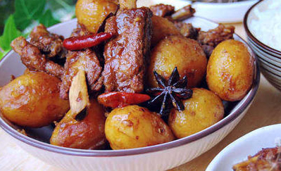 原料:猪小排、土豆、盐、冰糖、葱、姜、蒜、八角、桂皮、干辣椒、料酒、生抽、老抽、香叶、油