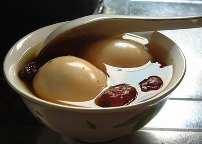 用红枣加桂圆煲红糖水,到枣烂桂圆绵时,打只鸡蛋;继续用小火焐熟鸡蛋。红枣、桂圆和红糖都有补血的功效,煮出的鸡蛋很滋补。