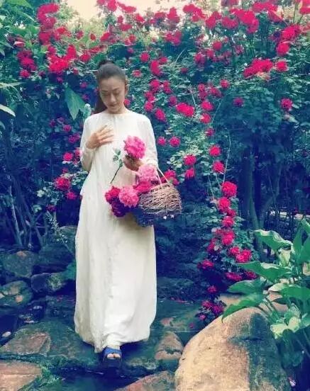 照片中年近60的杨丽萍一袭裸色长裙,飘飘然立于繁花丛中,好似粉嫩少女一般,不由得让人感叹,岁月似乎将她遗忘了,越活越年轻,越老越精致。