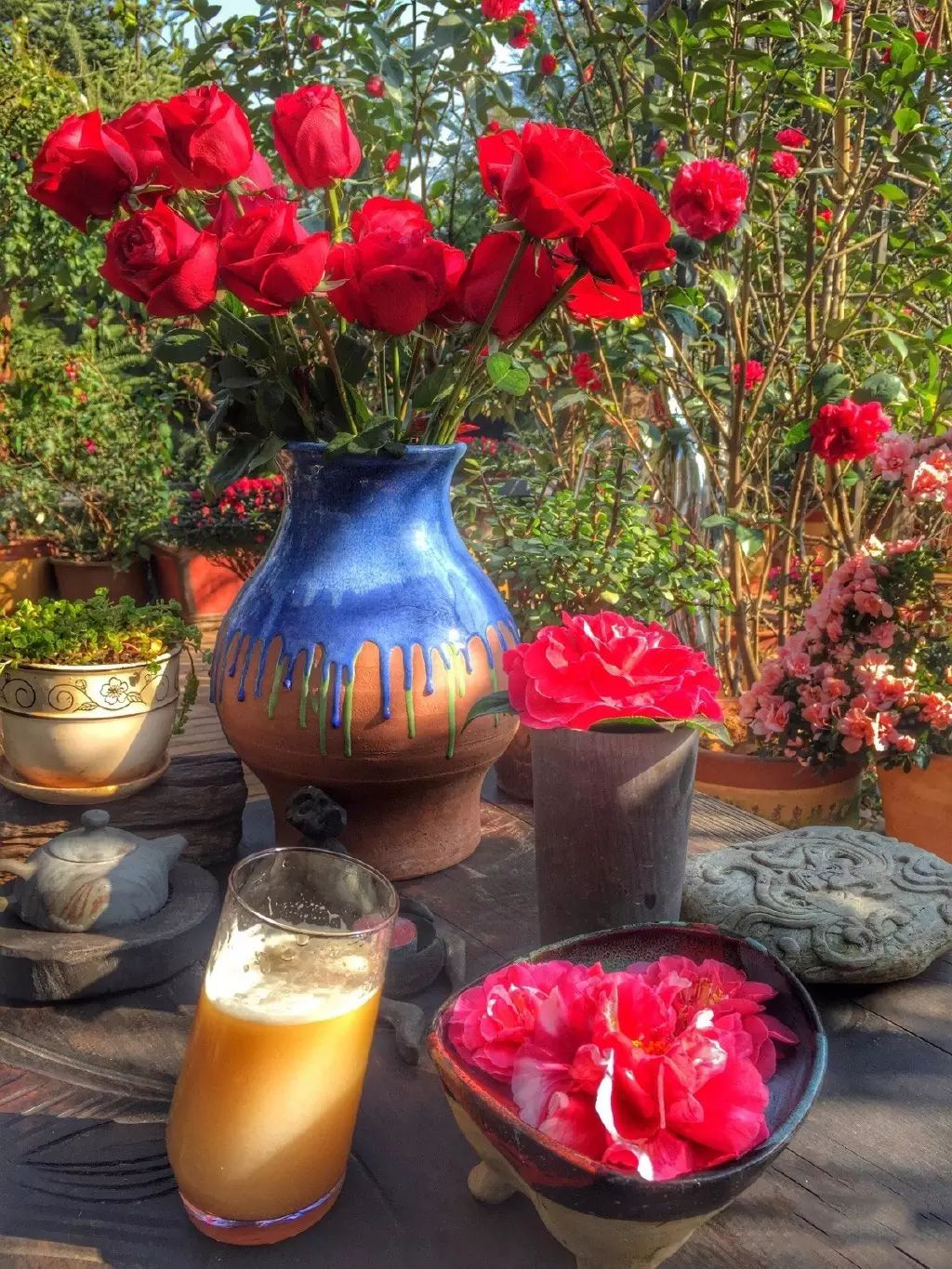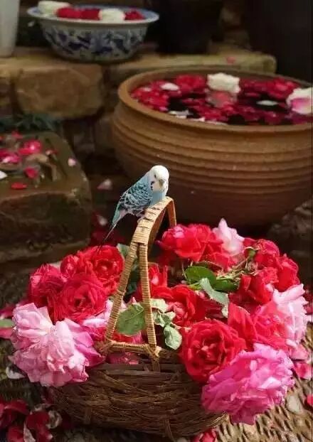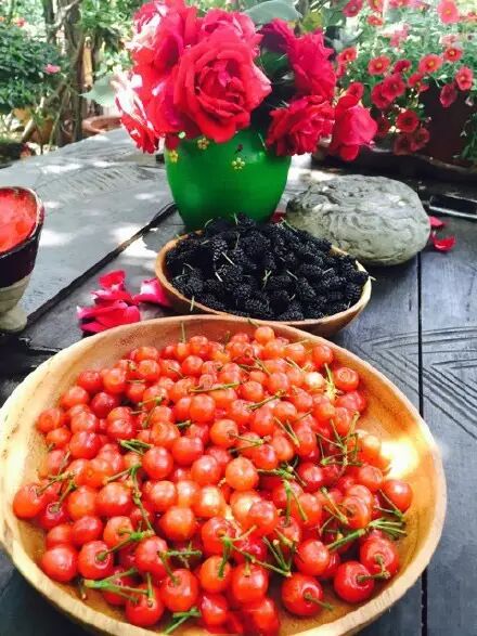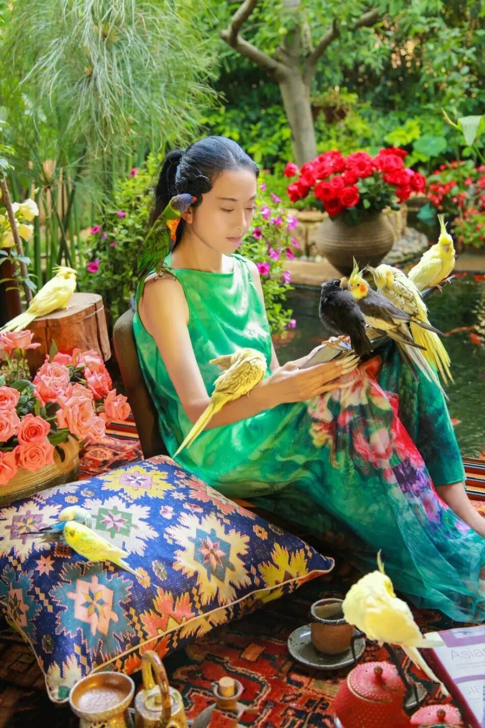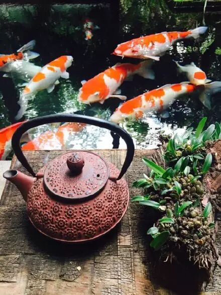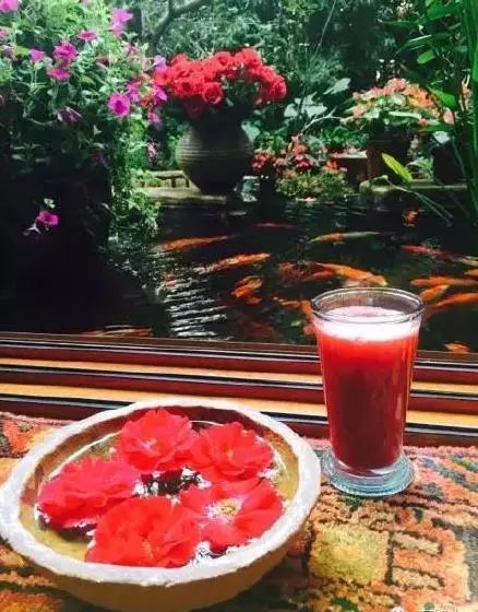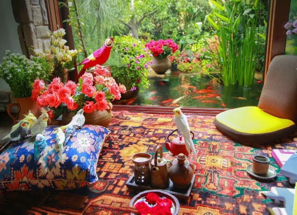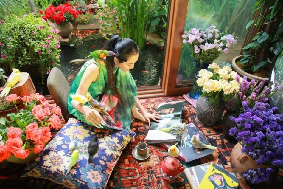 花开满园,鲤鱼满池,身边还围绕着可爱的鸟雀,你喝着茶,看着书……感受宁静的下午时光……这样的房子,这样的生活,大概只能存在无数人羡慕的童话故事中,却被杨丽萍呵护的这么好。