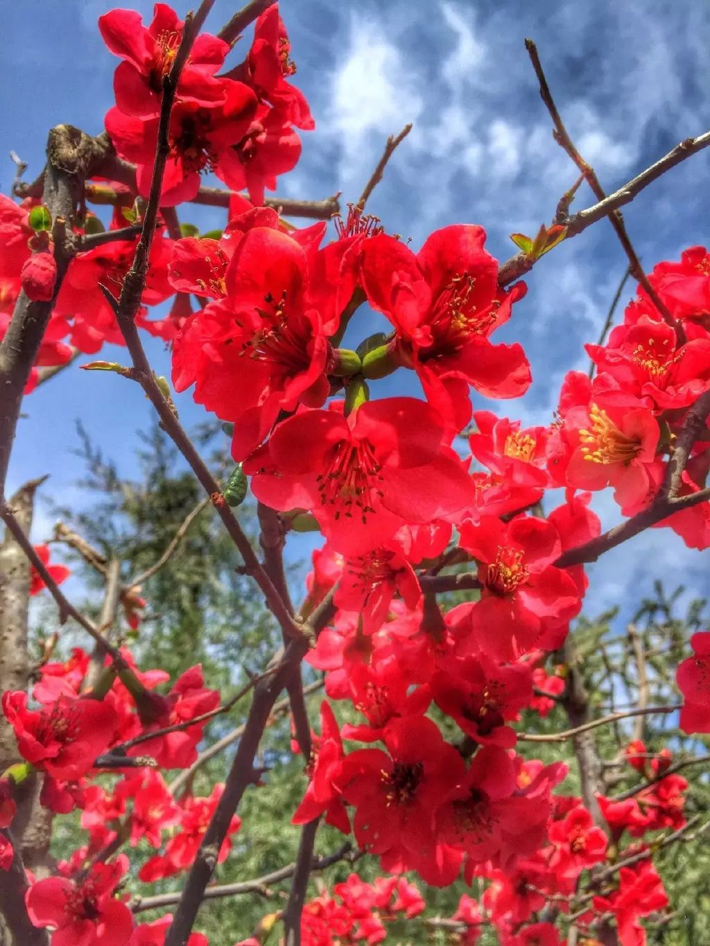 青石小路古朴幽静,暗生苔藓,高大的花丛枝叶交错,光影斑驳。鲜花繁盛灿烂,殷红夺目,恰有一人自花丛深处走来,步履轻盈,垂目低眉,秀发绾于头顶,插着一枚竹簪,周身上下散发着不食人间烟火的仙气。