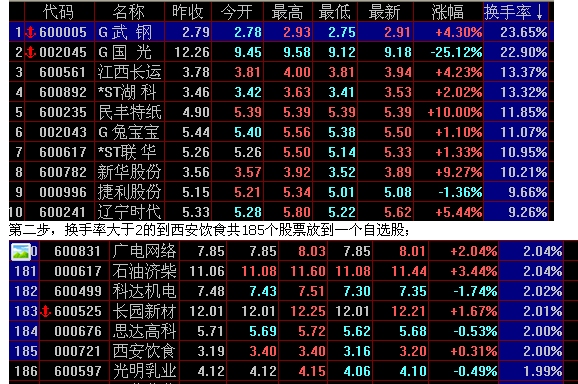 第一步,把换手率大于2的放到自选股或版快,看看我今天的选股步奏,先点换手率;