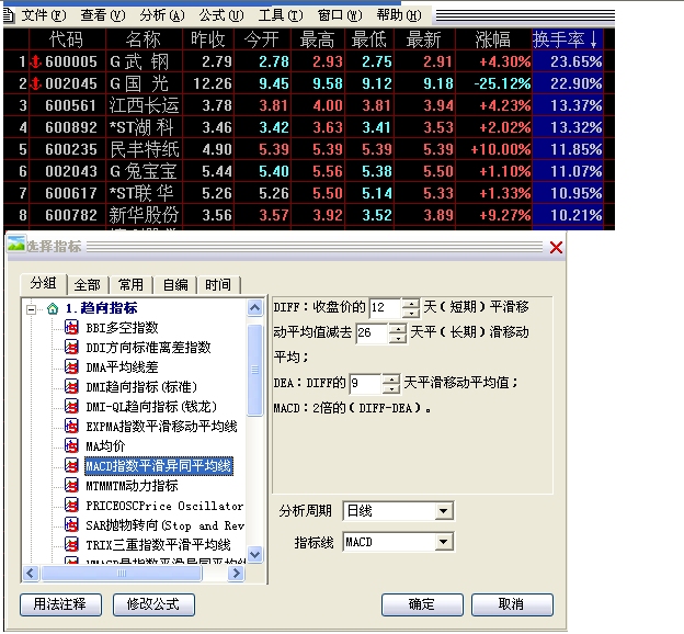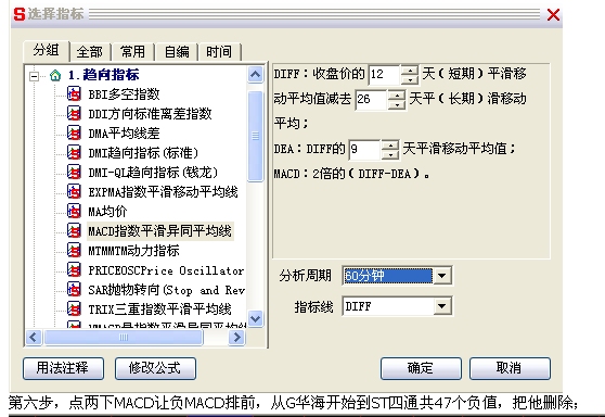 第三步,打开自选股,点工具,点指标排序,点开趋向指标,点MACD,因为MACD比较大众化,(我用的肯定更先进),请把指标线设为MACD,这时分析周期显示是日线,点确定;