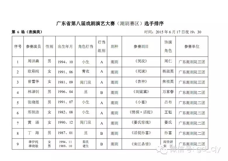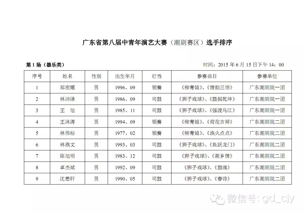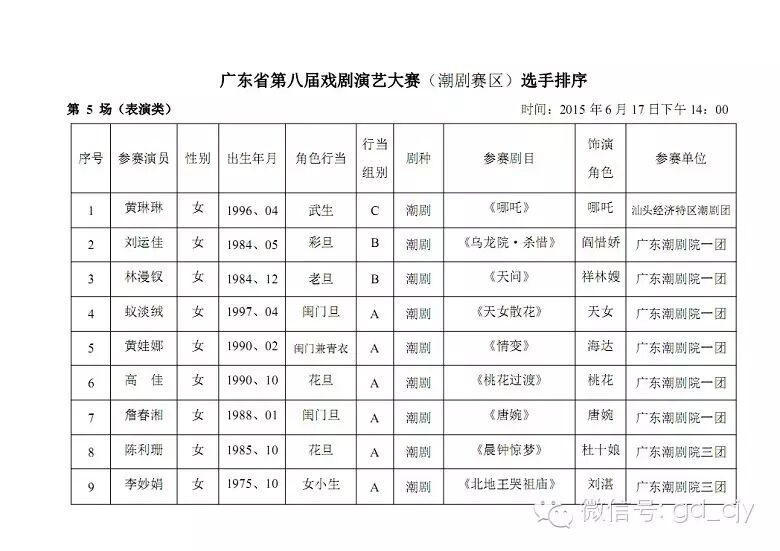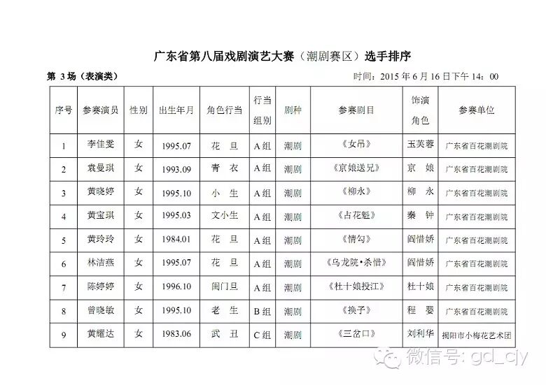 广东省第八届中青年演艺大赛(潮剧赛区) 参赛选手排序