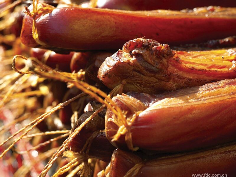 贴示:1,"腊味"是湖南的主要特点之一它有多种原料,主要有猪、牛、鸡、鱼、野鸭等品种。制腊猪肉:将带此猪肉5000克,洗净滤去水,切成5大条,加精盐250克、花椒子10克、火硝1.5克、白糖50克,腌4天后翻动一次,再腌3天取出以清水洗净,在条肉的一端系上麻绳,挂在阳光下晒2天,然后挂在熏房里,用锯木屑、干果壳或糠壳作烟料,连续熏36个小时,每条猪肉呈烟熏黄色,即成腊肉。制腊鸡:将净鸡从脊背部剖开,去掉食袋和内脏,在大腿肉厚的部位划一刀,使作料入味,腌制方法同腊肉内。制腊鱼:鲜鱼500克,每条鱼从脊背上剖开去掉鳃和内脏,洗净滤去水,用精盐250克、花椒子10克、火硝1.5克、白糖50克拌匀,腌3天后洗净,挂在阳光下晒2天,然后挂在熏房里继续熏36个小时,即成腊鱼。