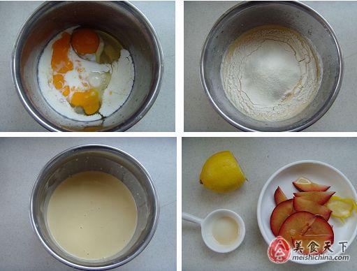 4、李子切片,用新鲜柠檬汁和少许蜂蜜拌匀腌渍备用。